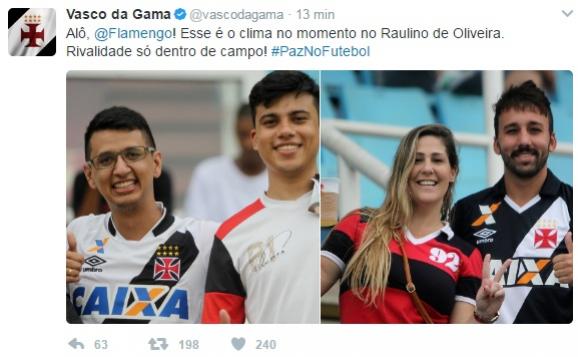 Twitters de Vasco e Urubu 'conversam' e postam fotos de torcedores rivais confraternizando