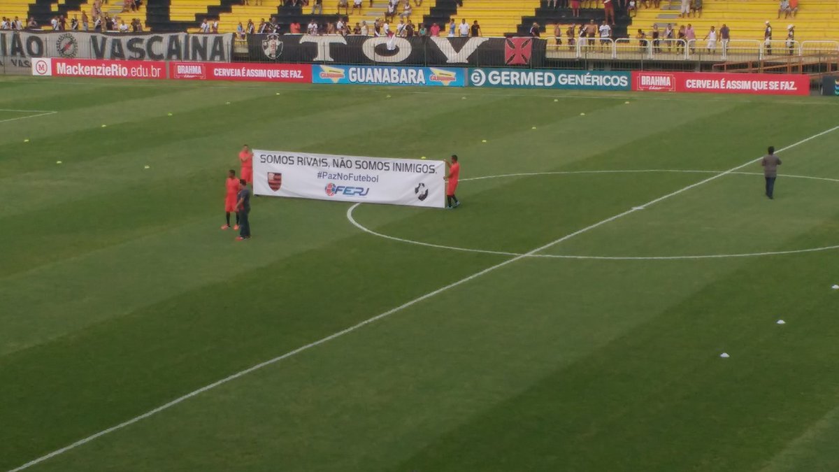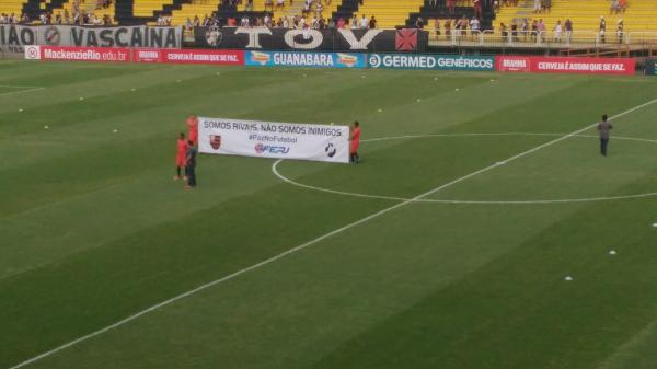 Faixas com "Somos rivais, não somos inimigos" e "por favor torçam, não briguem!" são estendidas no Raulino. #FlaVAVEL #VascoVAVEL