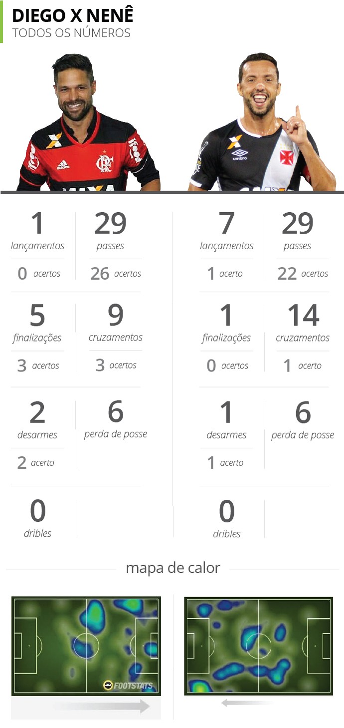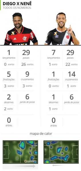 Nos números, Diego acertou quatro passes a mais que Nenê – ambos tentaram a mesma quantidade, 29. O camisa 35 do Flamengo também foi melhor nos cruzamentos: acertou três de nove, contra um de 14 do vascaíno – um indicativo de como o cruz-maltino foi mal até nas bolas paradas, um de seus pontos fortes.