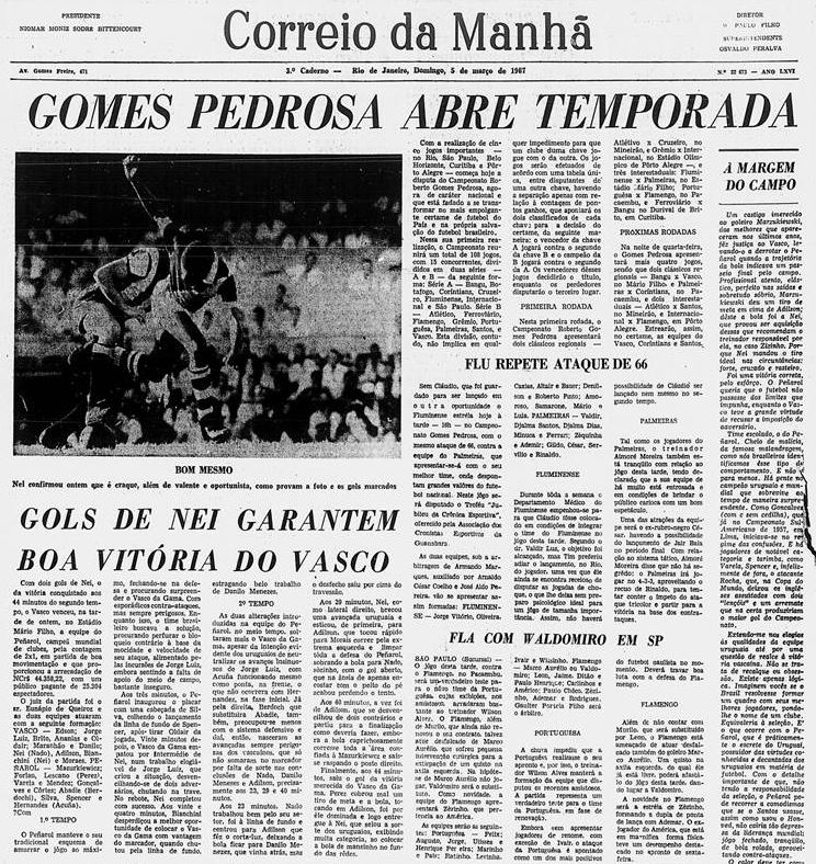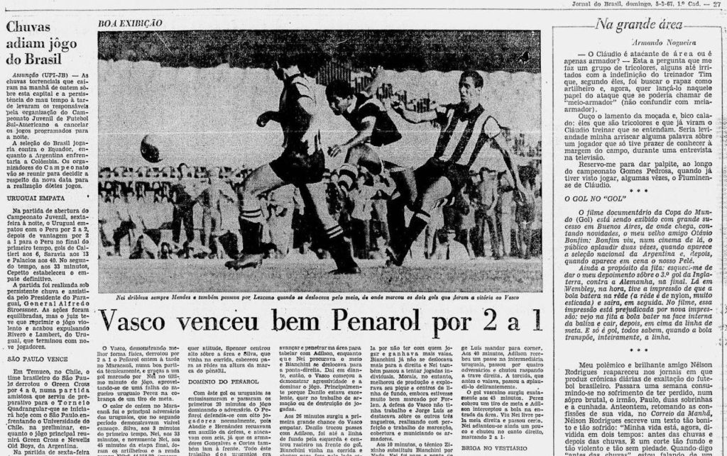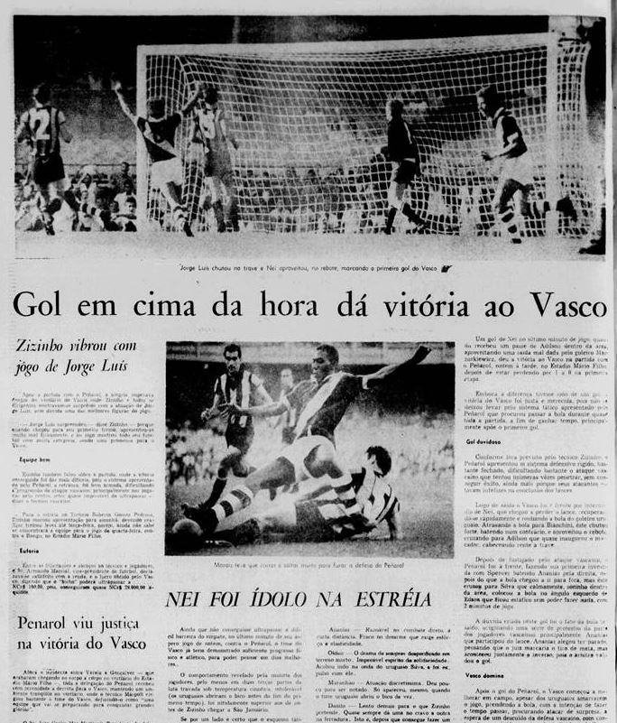 Finalmente, aos 44 minutos, saiu o gol da vitória merecida do Vasco da Gama. Perez cobrou mal um tiro de meta e a bola, tocando em Adilson, foi por ele dominada e logo entregue à Nei, que selou a sorte dos uruguaios, exibindo muita categoria, ao colocar a bola de mansinho no fundo das redes.” (Correio da Manhã – 05/03/1967)