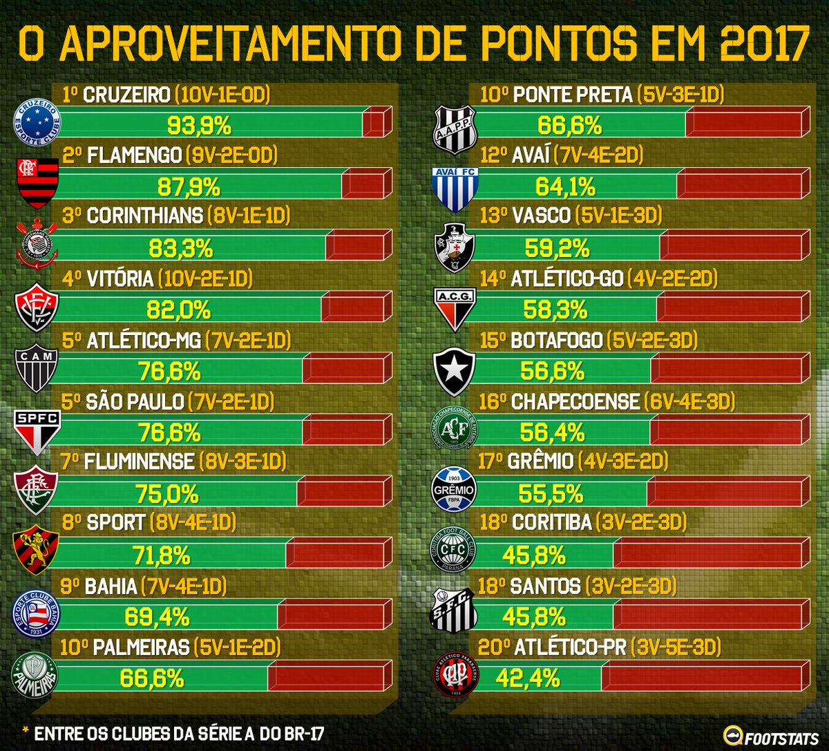 Footstats @Footstats Pontos ganhos em relação aos disputados. O ranking de aproveitamento dos times da Série A em 2017 (Fora da lista, o Internacional tem 69,4%)