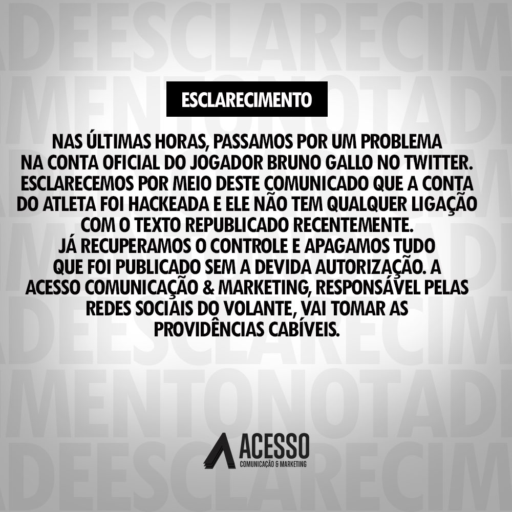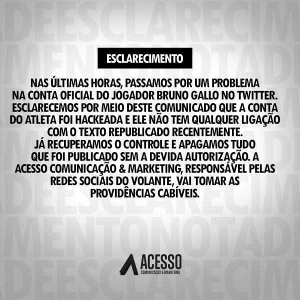 Nota da NETVASCO: O esclarecimento provavelmente se deu porque, no início da noite desta 4ª-feira, uma torcedora escreveu "Fora Cristóvão" no Twitter e a conta de Bruno Gallo - que agora se sabe ter sido invadida - deu RT (Retweet) na mensagem, causando polêmica entre os vascaínos.