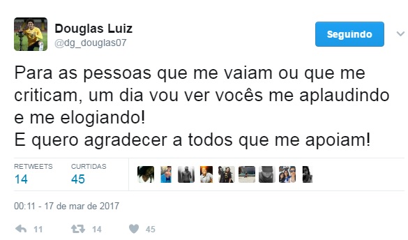 Douglas Luiz @dg_douglas07 Para as pessoas que me vaiam ou que me criticam, um dia vou ver vocês me aplaudindo e me elogiando! E quero agradecer a todos que me apoiam!