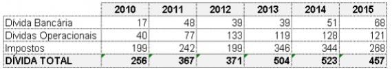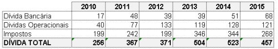 Ou seja, as duas informações mais relevantes — aumento da dívida entre 2008 e 2014 e pagamento entre 2015 e 2016 — não parecem ser completamente corretas, ressalvando-se que a fonte é incompleta. Ampliando um pouco mais a análise, e utilizando os nossos conceitos de endividamento — que é a soma entre bancos, operacionais e fiscais —chegamos ao quadro abaixo.