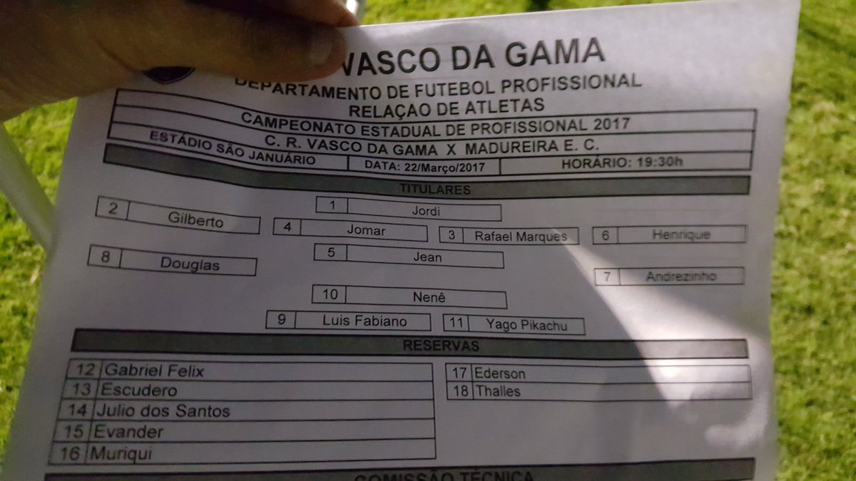 Fonte: Twitter oficial do Vasco Felipe Schmidt @schmidt_felipe Boa noite! Vasco escalado para enfrentar o Madureira. Pikachu é a novidade. #gevas