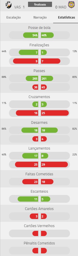 Confira as estatísticas do 1º tempo de Vasco x Madureira