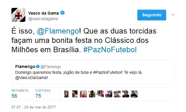 Adversários em Brasília neste domingo, Vasco e Flamengo promovem juntos o clássico nas redes sociais. Confira