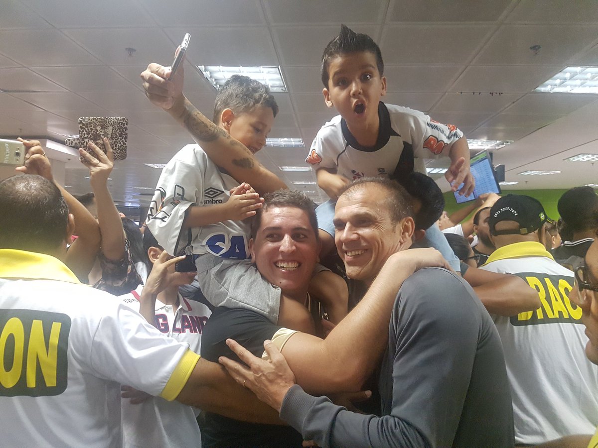 O Vasco só jogará o clássico com o Flamengo no domingo, mas a torcida cruz-maltina começou a fazer festa na noite deste sábado. A delegação foi recebida em Brasília por grande número de torcedores, com direito a uma pequena bateria para animar os inúmeros cantos entoados no aeroporto. No fim, o presidente Eurico Miranda puxou o tradicional grito de Casaca.