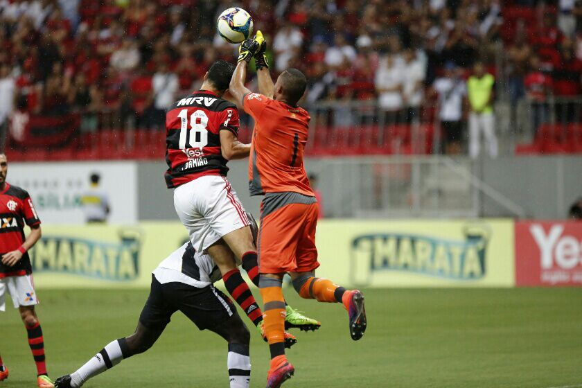Mas não demorou e o Fla chegou ao empate. Aos 14, Mancuello cobrou escanteio pela direita e William Arão subiu mais que a zaga para, de cabeça, marcar o primeiro do Rubro-Negro no Mané Garrincha.