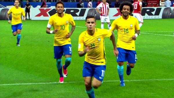 Com um gol do ex-vascaíno Philippe Coutinho (o primeiro, aos 33 minutos do 1º tempo), o Brasil derrotou o Paraguai por 3 a 0 na noite desta 3ª-feira, no Itaquerão, em São Paulo, e praticamente se garantiu na Copa do Mundo da Rússia 2018. No 2º tempo, Neymar (aos 18 minutos) e Marcelo (aos 40) completaram o placar.