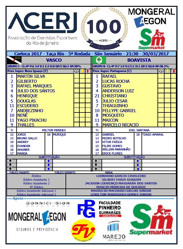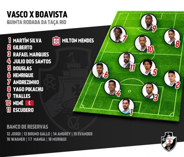 Fonte: Twitter oficial do Vasco Acerj @acerjrio Escalações de Vasco e Boavista pela 5ª Rodada da Taça Rio 2017
