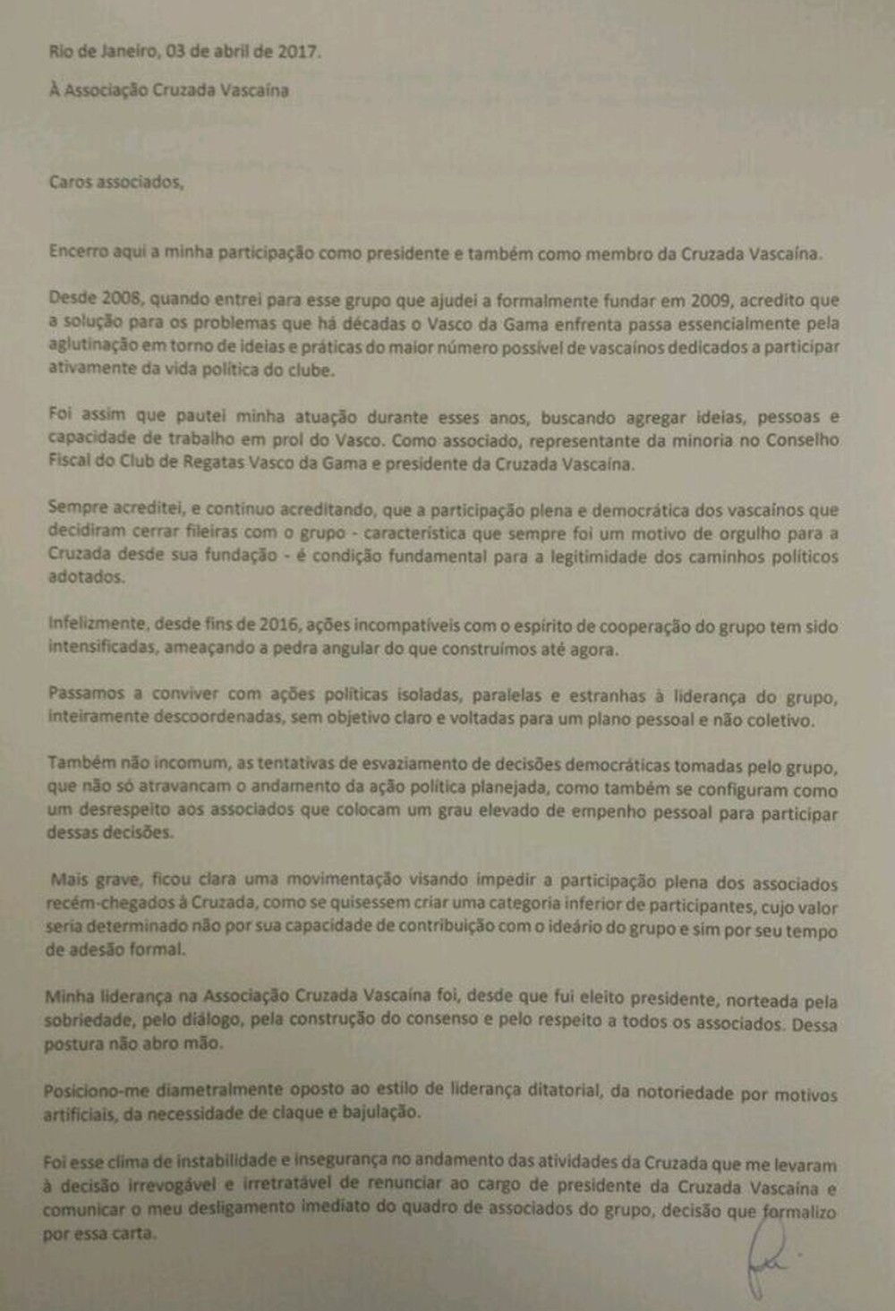 Principal grupo de oposição no Vasco, a "Cruzada Vascaína" está sem presidente. João Carlos Amorim entregou carta de renúncia nesta quarta-feira e deixou a diretoria em meio a divergências internas. Entre os motivos, a aproximação com Fernando Horta, primeiro vice-presidente geral do Vasco. Outros membros da diretoria da "Cruzada" também deixaram o grupo de oposição - que apoiou Julio Brant, na chapa "Sempre Vasco".