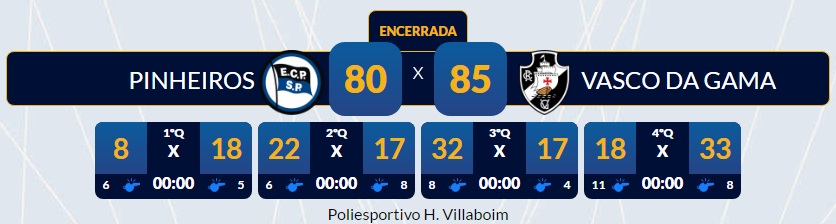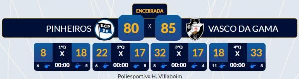 Em um jogo que os dois times poderiam ter liquidado a parada antes do quarto período, o Vasco derrotou o Pinheiros, em São Paulo, no Ginásio Villaboim, e empatou a série melhor de cinco das oitavas de final do NBB. O placar foi de 85 a 80, mas o Vasco poderia ter matado no segundo período, quando abriu 27 a 12 e dominava a partida. Já o Pinheiros conseguiu a recuperação, colocou 16 de frente no terceiro período, mas despencou no último quarto. O próximo jogo é neste domingo, às 16h, em São Paulo, com tempo real no GloboEsporte.com
