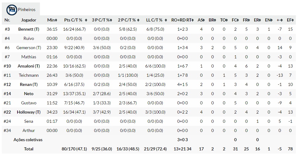 Murilo foi o grande nome da noite, anotando um duplo duplo. O pivô foi essencial no início do jogo, quando marcou oito pontos e seis rebotes em dez minutos. E nos últimos minutos, em que conseguiu duas bolas decisivas. No fim, 26 pontos e 14 rebotes, e um aproveitamento de 100% nos lances livres (10 em 10). Bennet, com 16 pontos, e Holloway, também com 16, foram os cestinhas do Pinheiros.