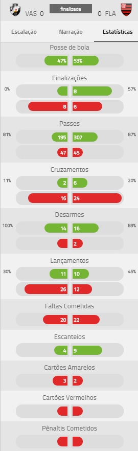 Confira estatísticas de Vasco 0 x 0 Urubu