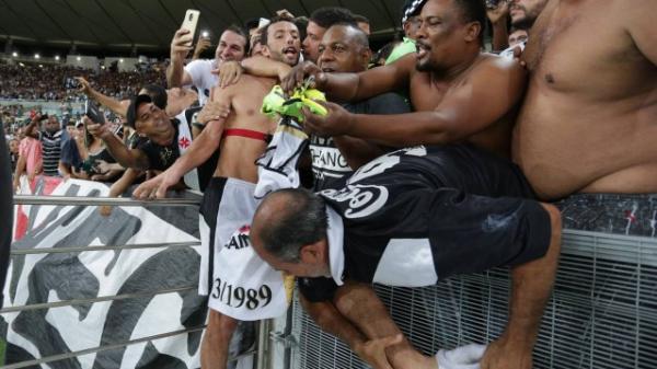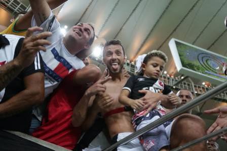 O atacante Nenê foi, literalmente, para a galera do Vasco comemorar a classificação para a final da Taça Rio. Após o empate de 0 a 0 com o Flamengo no Maracanã, que classificou o Cruz-Maltino, o craque foi comemorar com os torcedores e “perdeu” quase tudo: chuteiras, camisa e até a meia. Isso mesmo, até a meia, como pode-se ver na foto acima.