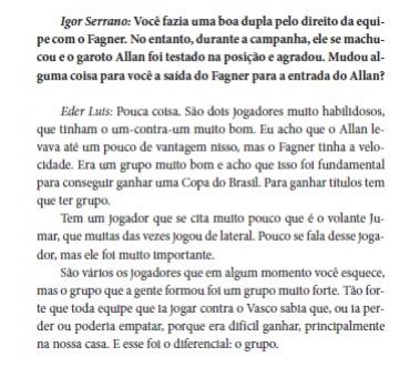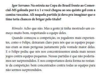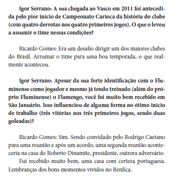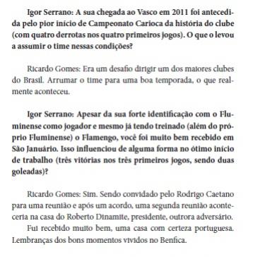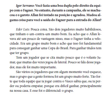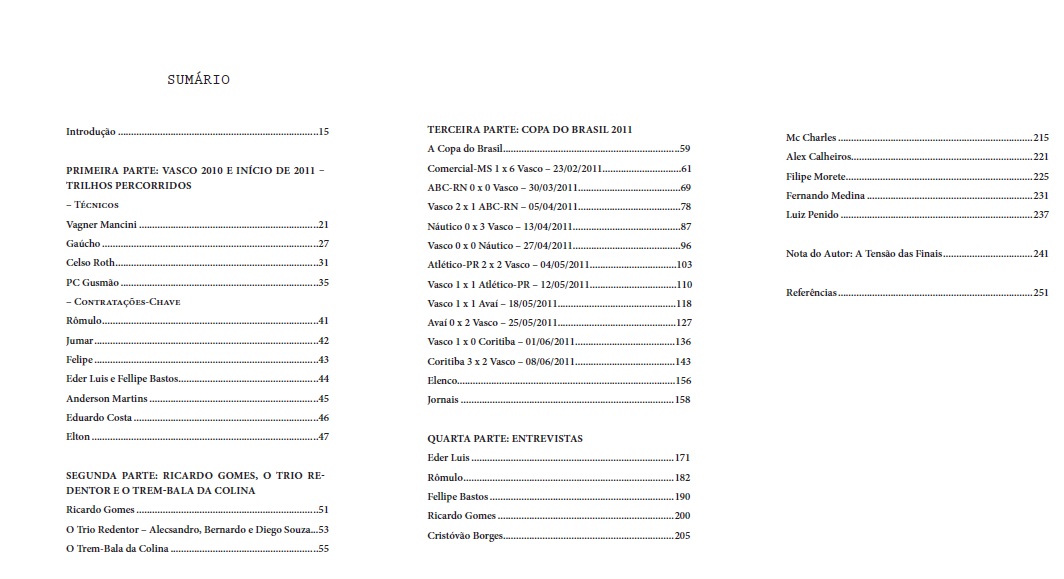 IS: O livro mostra como foi o caminho do Vasco até aquela noite de 08/06/2011. A construção do elenco, a passagem de quatro treinadores no ano anterior (sendo que dois titulares tiveram oportunidades e agarraram nessa época – com Gaúcho e PC Gusmão que Dedé e Rômulo, respectivamente, viraram titulares), a chegada de Ricardo Gomes e do trio redentor, e, é claro, todos os jogos da campanha são recontados como se você estivesse assistindo as partidas novamente. Tem ainda um detalhe bacana dedicado aos colecionadores de camisas do Vasco. Todos os jogos da campanha são acompanhados de ilustração do modelo de uniforme utilizado na partida com os detalhes específicos (patrocínios pontuais; frase da Penalty em substituição à logomarca; short da temporada 2009/10 usado equivocadamente com o uniforme 2010/11...). Por fim, ainda temos um capítulo destinado a entrevistas de quem de alguma forma participou da conquista. Assim, entrevistei comissão técnica e jogadores (Ricardo Gomes, Cristóvão Borges, Eder Luis, Rômulo e Fellipe Bastos), imprensa (Luiz Penido e Alex Calheiros), sócios do clube e MC Charles, criador do funk que embalou as comemorações por norte e sul deste Brasil: o "Trem-Bala da Colina"!