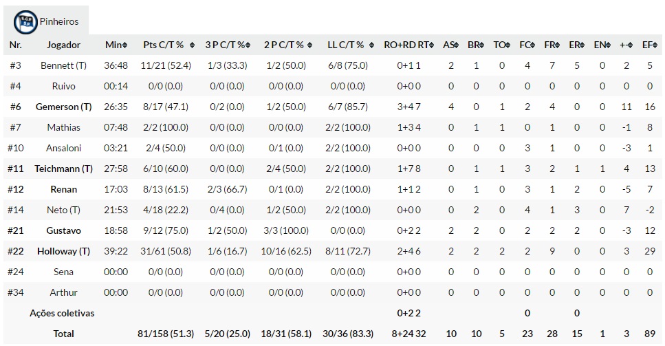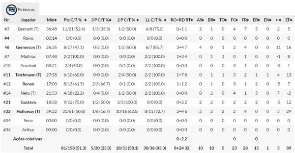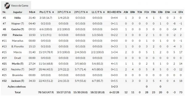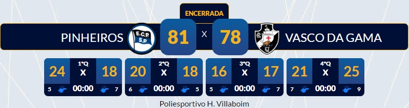 O clube carioca começou com tudo no último quarto. Aos oito minutos, David Jackson empatou a partida em grande lance de três pontos, e Hélio colocou os vascaínos pela primeira vez a frente do placar (65 a 63). Apesar da evolução, o Pinheiros buscou o resultado e, no fim, com uma sequência de faltas recebidas e lances livres convertidos, garantiram a vitória por 81 a 78 em casa.