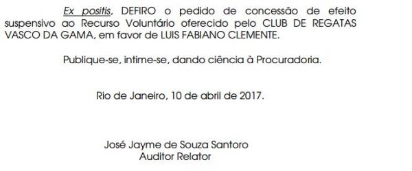 Auditor José Jayme Santoro CONCEDEU efeito suspensivo p/ Luis Fabiano do @vascodagama liberado p/ jogar final Taça Rio domingo c/ Botafogo.