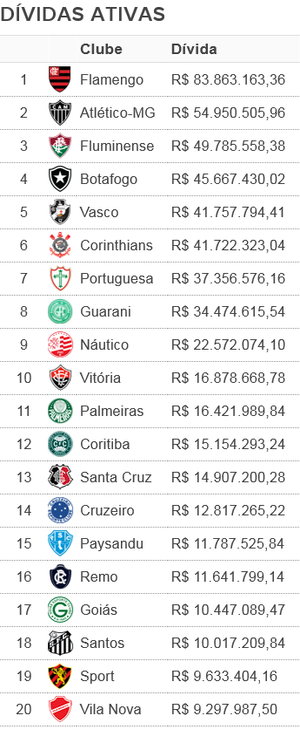 Em tempos de reforma da Previdência Social para conter o imenso rombo instalado nas finanças do país - da ordem, segundo o Governo, de R$ 450 bilhões - e discurso de aperto geral para o trabalhador brasileiro quanto às novas regras para aposentadoria, há uma parte que cabe nesse latifúndio causada justamente pela inadimplência daqueles responsáveis por uma das maiores paixões desse povo. Se os clubes de futebol procuram levar mais alegria no dia a dia dos contribuintes e suas famílias, esse custo-benefício anda doendo, e muito, no bolso. Nesta terça-feira, o "Redação SporTV", em matéria exclusiva do repórter Fred Justo, divulgou a extensa lista de devedores à União. Segundo levantamento da Procuradoria Geral da Fazenda Nacional, eles juntos acumulam débito de quase R$ 800 milhões. E o Flamengo, clube de maior torcida e apelo popular, aparece justamente como o maior vilão: o Rubro-Negro, hoje, tem uma dívida ativa astronômica de R$ 83.863.163,36 a ser quitada (assista ao vídeo acima).