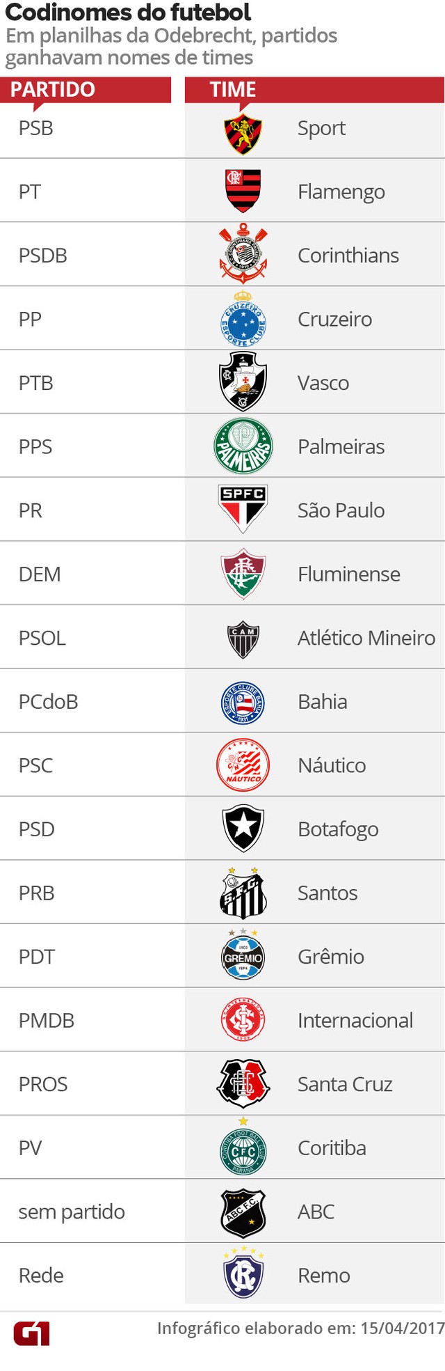 A lista conta com 18 partidos. Além dos citados, constam na lista PMDB (Internacional), PSB (Sport), PP (Cruzeiro), PTB (Vasco), PPS (Palmeiras), PSOL (Atlético Mineiro), PCdoB (Bahia), PSC (Náutico), PSD (Botafogo), PRB (Santos), PDT (Grêmio), PROS (Santa Cruz), PV (Coritiba) e Rede (Remo). Político que não tinha partido era identificado como ABC. Nessa tabela, explica-se ainda que presidente era centroavante, governador era descrito como meia, senador chamado de ponta, deputado federal era apelidado de volante e deputado estadual era zagueiro. Quem não tinha cargo e pertencia a base de partidos, recebia o apelido de goleiro.