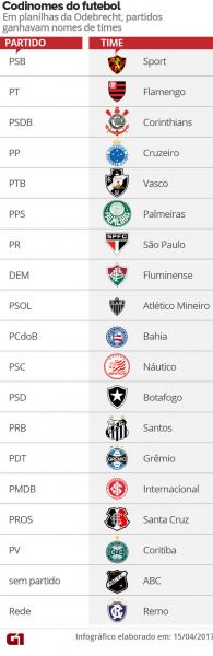 No jogo da Odebrecht, Fla Flu é PT contra DEM e Corinthians e São Paulo é PSDB contra PR. A escolha de times de futebol para substituir o nome de partidos foram adotadas em algumas das planilhas do Departamento de Operações Estruturadas, o conhecido "departamento da propina". Algumas das planilhas entregues aos investigadores usaram os termos e para designar qual cargo ocupava o político beneficiado as posições de jogadores eram usadas, com os pagamentos indo de goleiro (sem cargo) a centroavante (presidente).