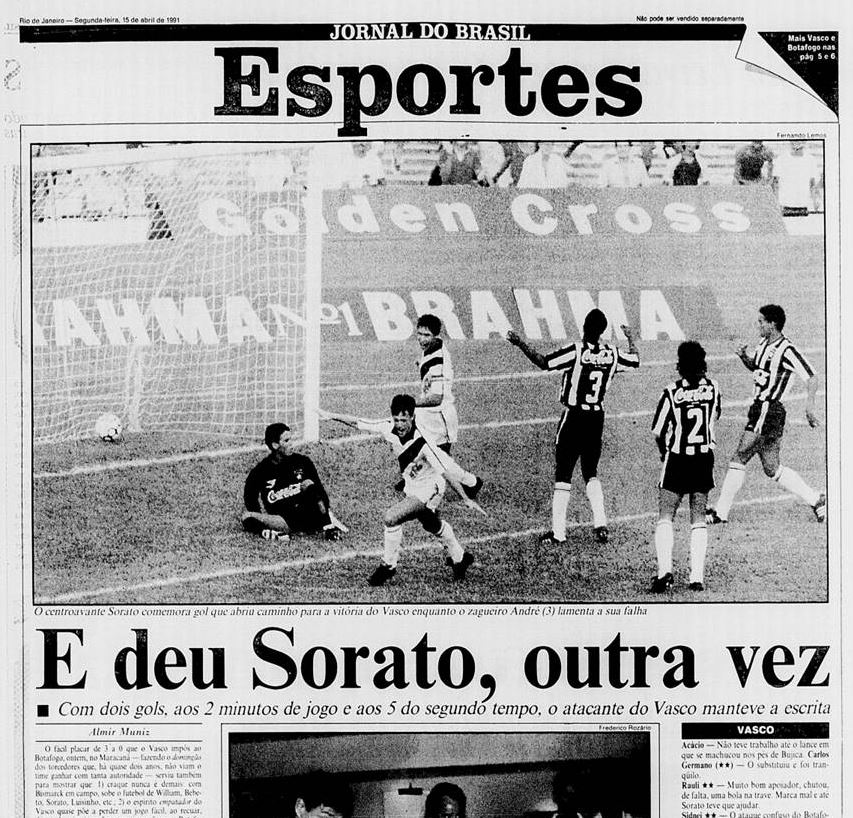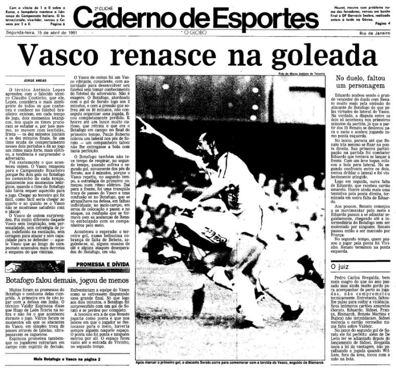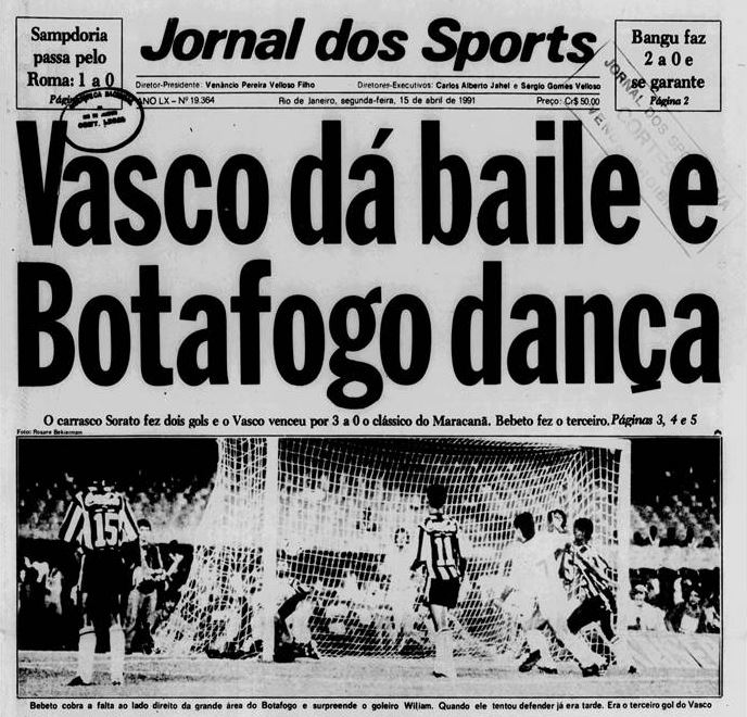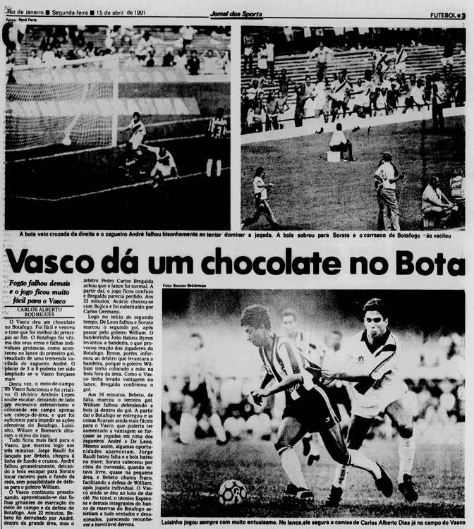 Aos 16 minutos, Bebeto, de falta, marcou o terceiro gol. William falhou defendendo a bola já dentro do gol. A partir daí o Botafogo se entregou e as coisas ficaram ainda mais fáceis para o Vasco, que poderia ter aumentado a vantagem se forçasse as jogadas em cima dos zagueiros André e De Leon. Mesmo assim, algumas oportunidades apareceram. Jorge Raulli bateu falta e a bola bateu na trave; Sorato cabeceou por cima do travessão, quando estava livre, quase na pequena área, e Bebeto chutou fraco, facilitando a defesa de William, após jogada individual. O Vasco ainda se deu ao luxo de dar olé. No túnel, o técnico Espinosa e demais integrantes do banco de reservas do Botafogo assistiam a tudo sentados e desanimados, parecendo reconhecer a inevitável derrota.” (Jornal dos Sports – 05/04/1991)