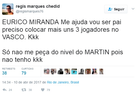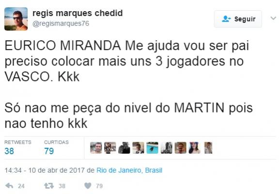 “Eurico Miranda. ¿Me ayuda? Voy a ser papá, preciso colocar unos 3 jugadores más en Vasco (da Gama)”, escribió ayer en portugués, en su particular tono de ñembo kachiãi el representante de jugadores rapai y fan de Crónica, Regis Marques.