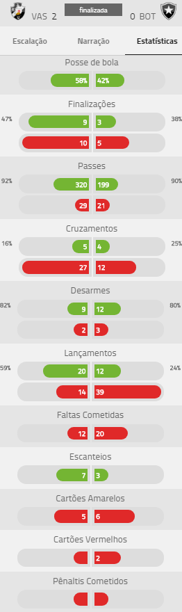 Confira estatísticas de Vasco 2 x 1 Botafogo