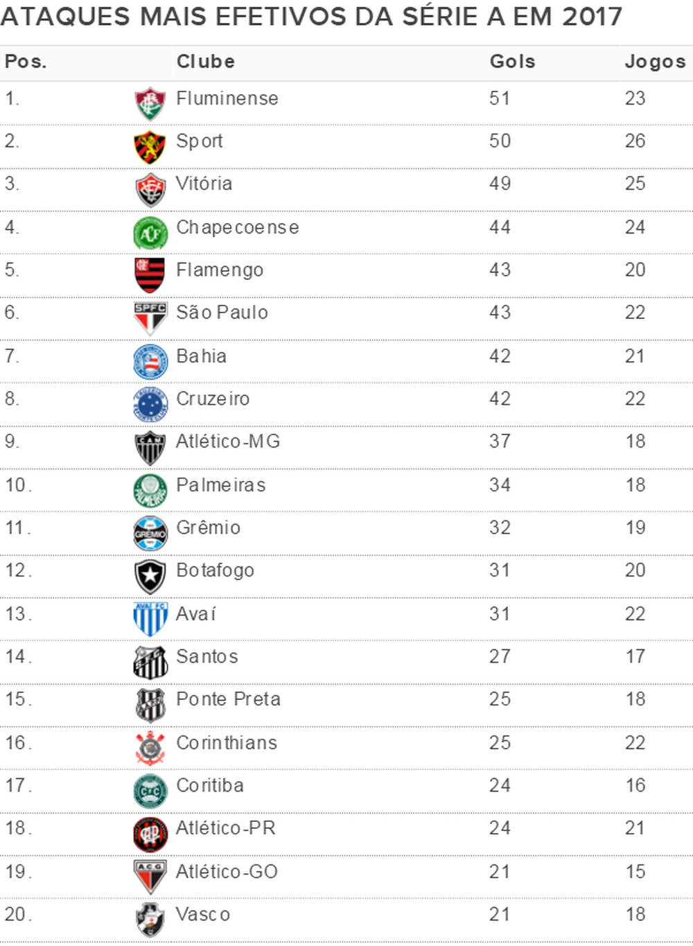 O Flu passou em braco apenas duas vezes no ano: contra o Internacional (Primeira Liga) e o Madureira (semifinal da Taça Guanabara). Quem mais chega perto no número de gols marcados é o Sport (confira na tabela abaixo). A equipe pernambucana atingiu a marca de 50 gols na última quarta-feira, mas já disputou 26 jogos. O pior ataque entre os 20 clubes é o do Vasco, adversário na semifinal do estadual no próximo sábado, no Maracanã. O Cruz-Maltino marcou apenas 21 gols em 18 jogos.