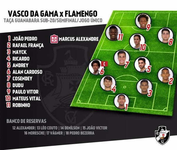 Vasco da Gama @vascodagama Escalação oficial do Vasco para o clássico contra o Flamengo em São Januário. #VASxFLA #ClássicoDosMilhões #CariocaSub20