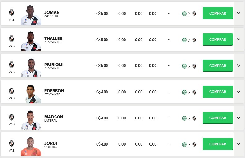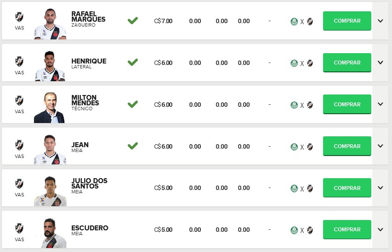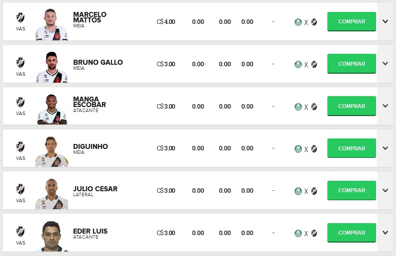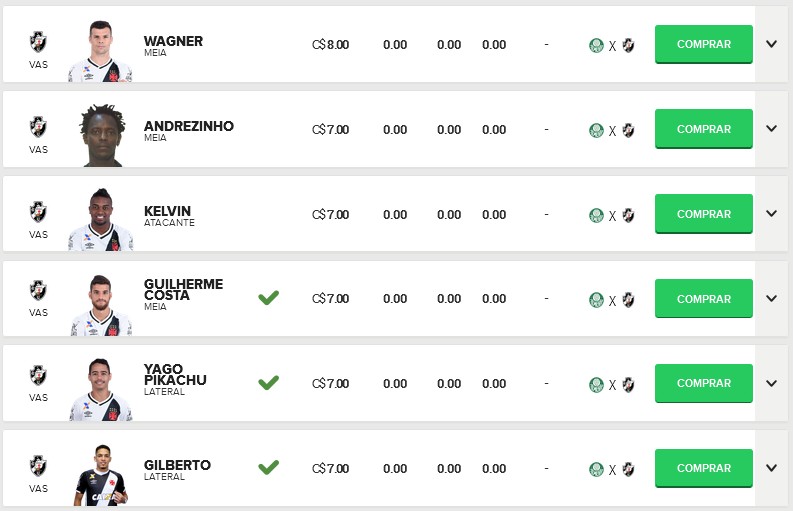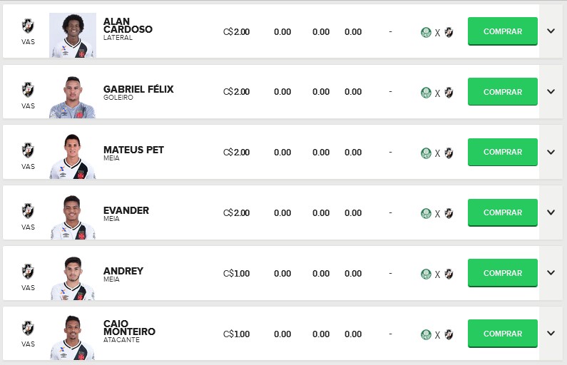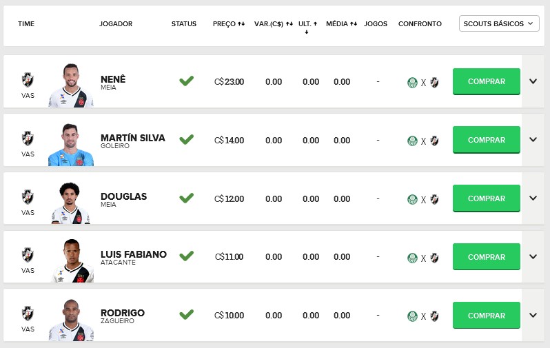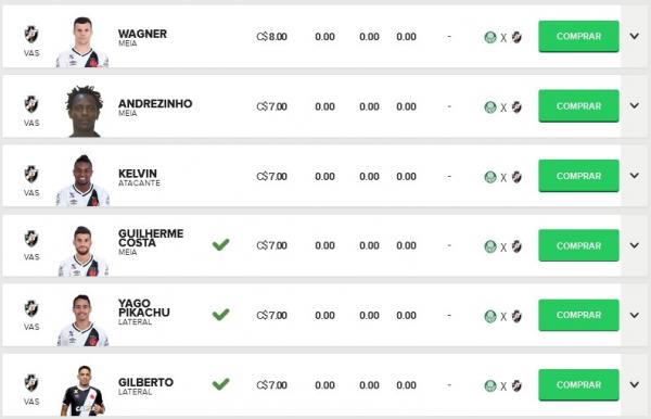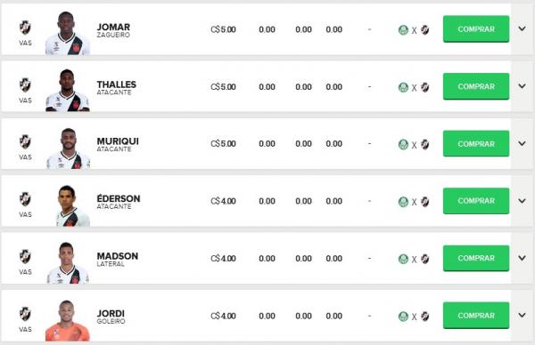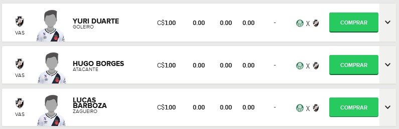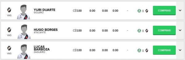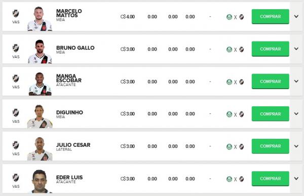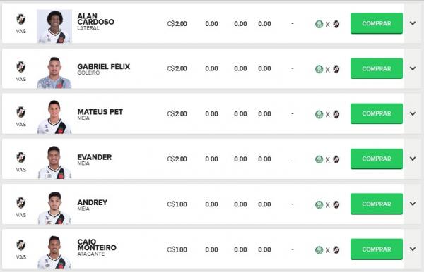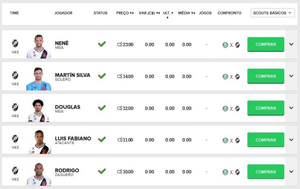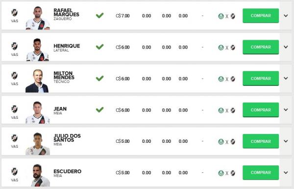Confira os preços dos jogadores do Vasco no Cartola FC