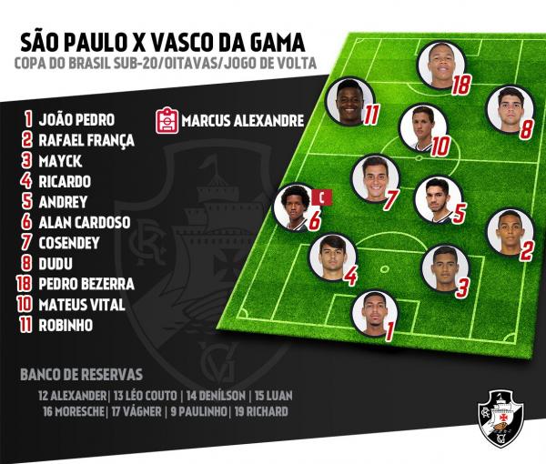 Vasco da Gama @vascodagama Escalação oficial do Vasco para o jogo contra o São Paulo. #SPFCxCRVG #CopaDoBrasilSub20 #MeninosDaColina
