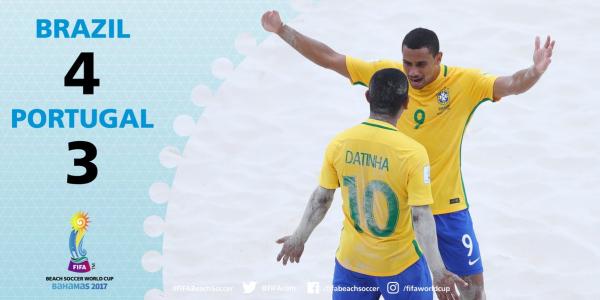 A Seleção Brasileira de Beach Soccer venceu Portugal por 4 a 3 nesta quinta-feira e passou à semifinal da Copa do Mundo das Bahamas. O vascaíno Catarino marcou um dos gols da partida.