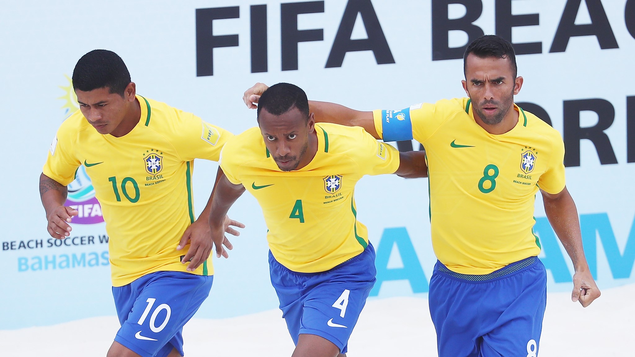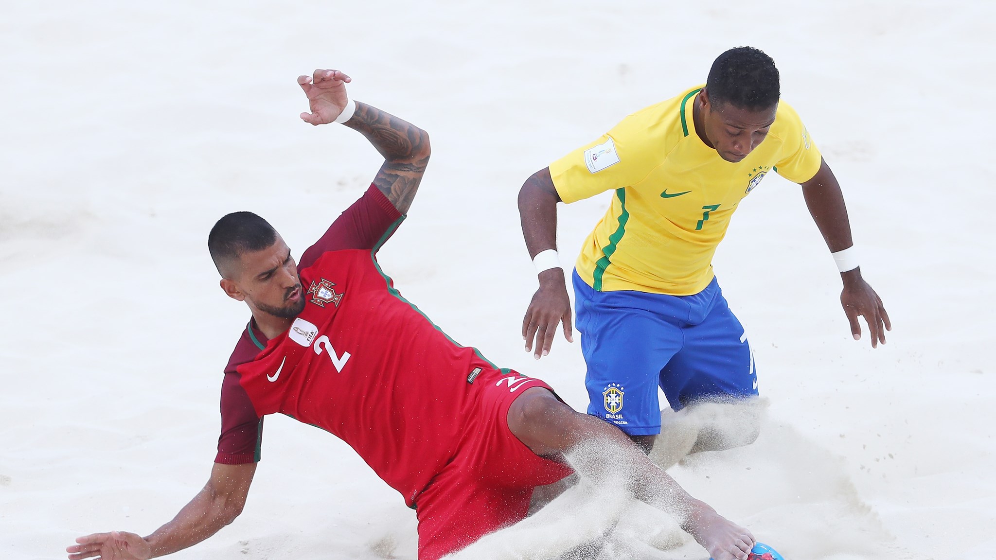 Brasil está nas semifinais da Copa do Mundo das Bahamas. Em uma final antecipada entre duas das maiores forças do futebol de areia, válida pelas quartas de final, o Brasil derrotou Portugal, atual campeão mundial, por 4 a 3, com um golaço de bicicleta de Rodrigo no fim. O jogador do Botafogo foi eleito a maior revelação da modalidade no mundo e é uma peça-chave na briga pelo título. Tetracampeão campeão mundial, o time comandado por Gilberto Costa teve dificuldades, mas fez do jogo coletivo o diferencial para neutralizar as jogadas dos atuais campeões mundiais e criar as melhores chances. Os outros gols da equipe canarinho foram marcados por Datinha, um de pênalti e outro de falta, e Catarino. Jordan (2) e Torres descontaram para os rivais. Com o resultado, a seleção ampliou para 33 a série invicta nas areias, desde 2015.