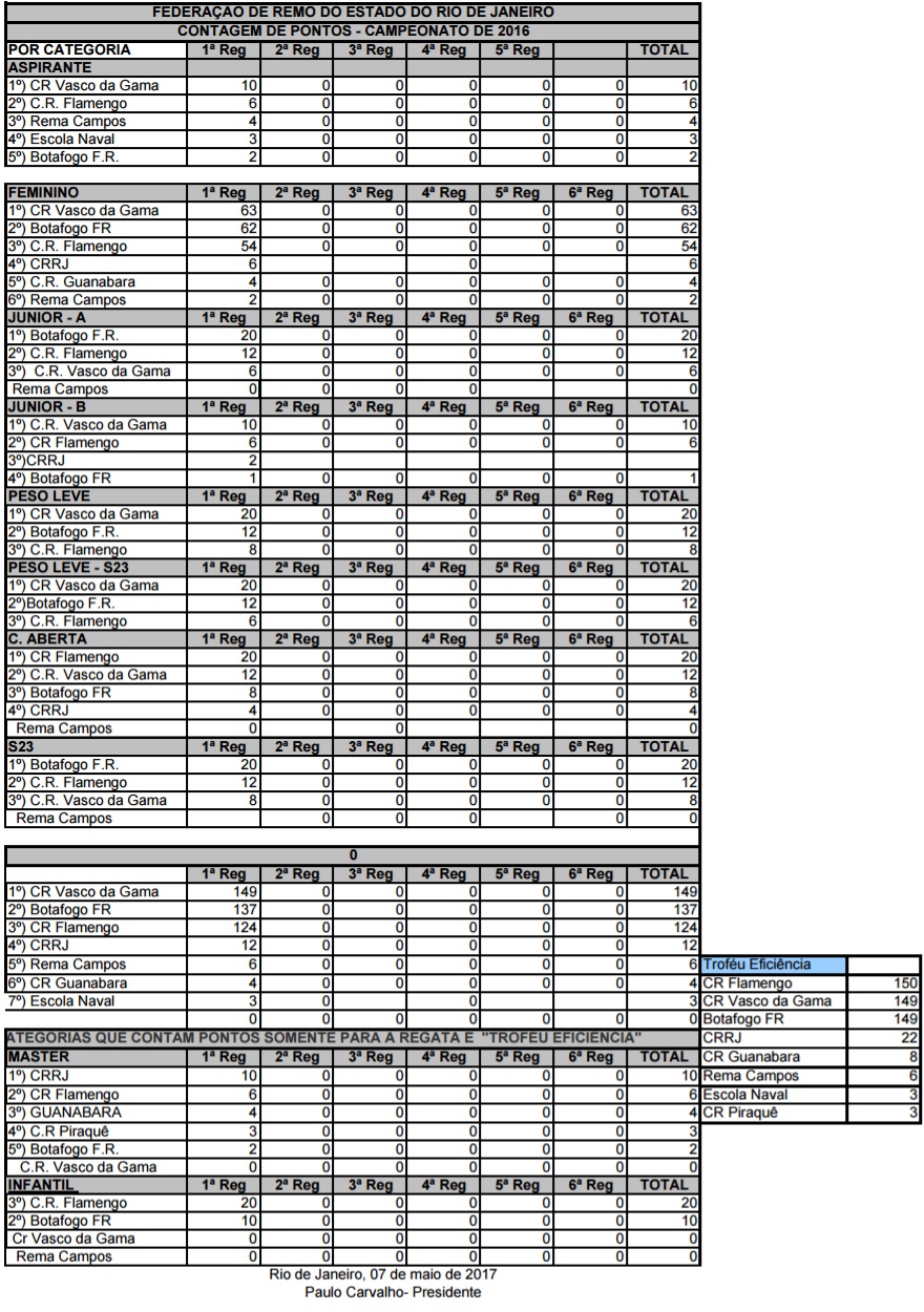 Foi aprovada, pela Comissão de Arbitragem, a 1ª REGATA DO CAMPEONATO DE ESTADUAL, realizada no dia 07 de maio de 2017, na Lagoa Rodrigo de Freitas cujo o resultado foi o seguinte: