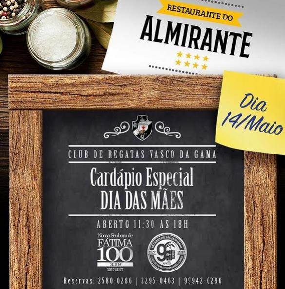 Neste domingo (14/05), em função da missa de Nossa Senhora de Fátima e do Dia das Mães, o restaurante do clube em São Januário terá horário de funcionamento especial. Aproveite e traga sua mãe para almoçar no Restaurante do Almirante!