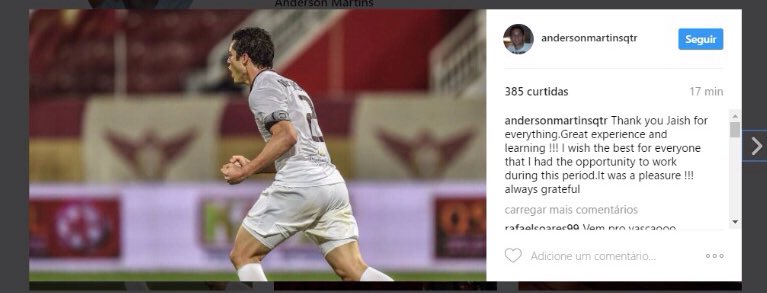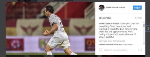 Anderson Martins se despede do Umm Salal-CAT em post e está praticamente fechado com o Vasco