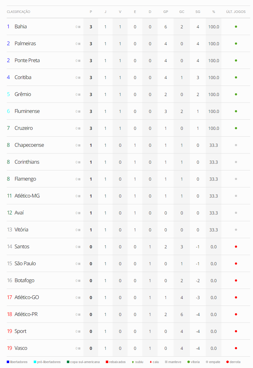 Terminada a 1ª rodada do Campeonato Brasileiro 2017, o Vasco, que perdeu para o Palmeiras por 4 a 0, está na 19ª colocação. Vasco e Sport estão empatados em todos os critérios de desempate: vitórias, saldo de gols, gols marcados e cartões (2 amarelos cada).