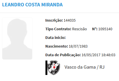 Rescisão de Leandrão com o Vasco é publicada no BID da CBF; confira