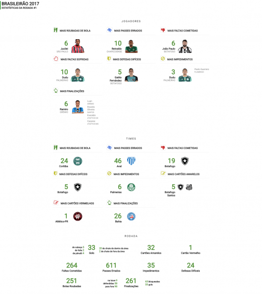 Sempre cercado de muita expectativa, o Brasileirão 2017 teve início neste fim de semana. Entre os destaques estatísticos, Dudu liderou dois rankings após a boa atuação na vitória por 4 a 0 do Palmeiras sobre o Vasco. O atacante foi o mais caçado em campo, tendo sofrido dez faltas no total, e também o "banheira" da rodada de abertura ao ser flagrado em impedimento por três vezes.