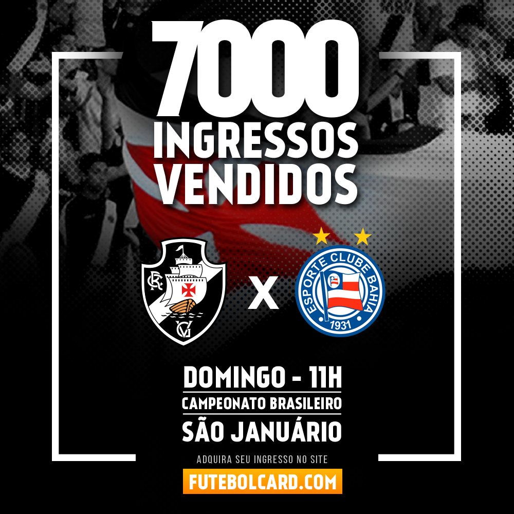 Sete mil ingressos vendidos para Vasco x Bahia, domingo, às 11 horas, em São Januário. Garanta o seu bilhete: http://futebolcard.com