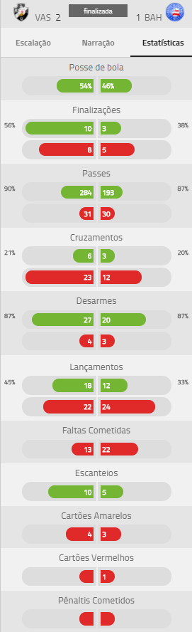 Confira estatísticas de Vasco 2 x 1 Bahia