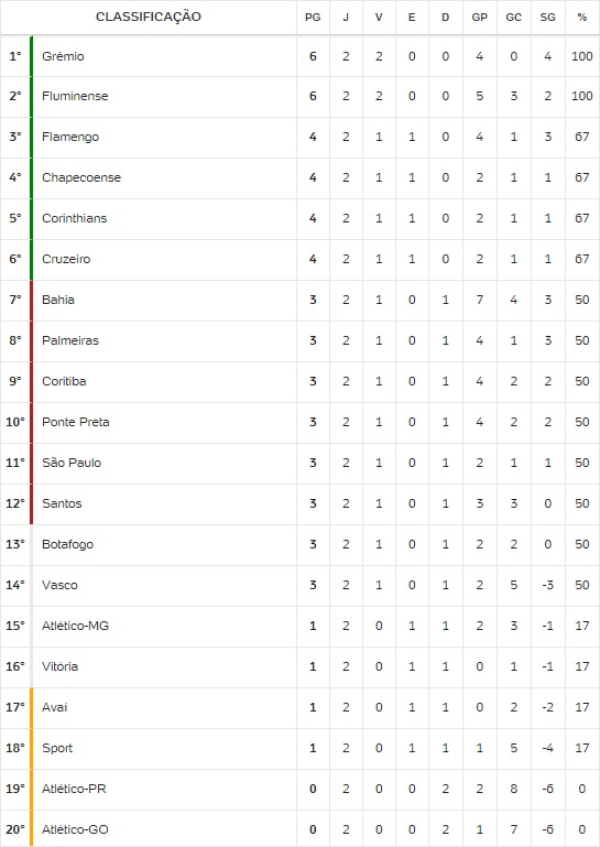 Terminada a 2ª rodada do Brasileiro 2017, o Vasco, que derrotou o Bahia por 2 a 1, subiu da 19ª para a 14ª posição na tabela e deixou a zona do rebaixamento.