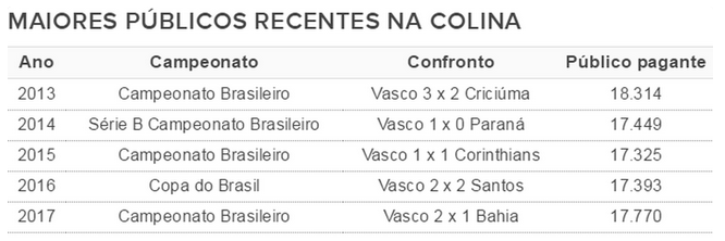 No último domingo, na primeira partida do Vasco em casa no Campeonato Brasileiro, São Januário teve 17.770 pagantes (19.030 presentes) na vitória por 2 a 1 sobre o Bahia. Foi o maior público pagante do clube nos últimos quatro anos. Em 2013, 18.304 pessoas compraram ingresso na vitória sobre o Criciúma por 3 a 2. De lá para cá, apenas três confrontos tiveram mais de 17 mil pagantes (confira na tabela abaixo).