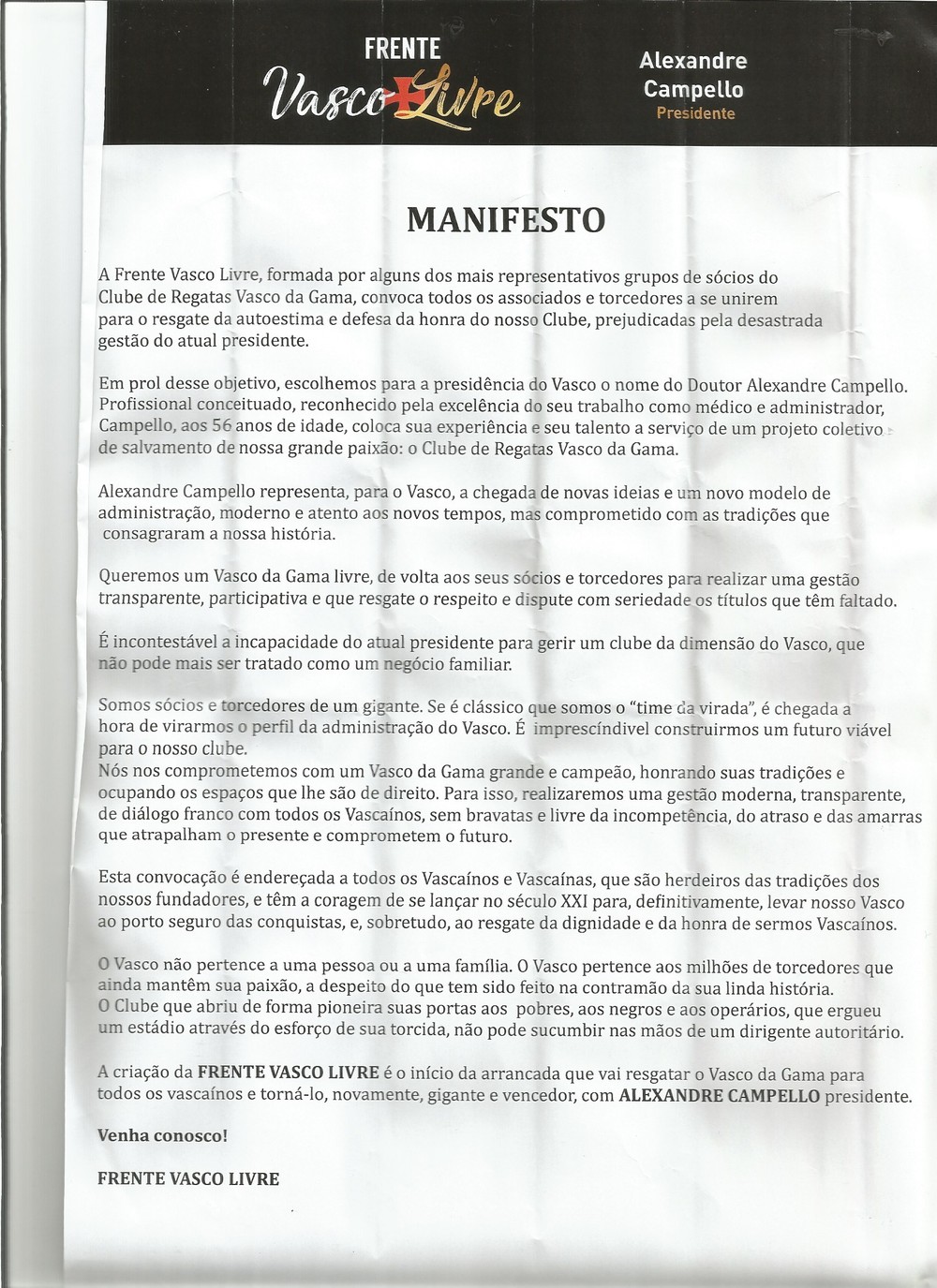 Nesta segunda-feira, o médico Alexandre Campello lançou sua candidatura à presidência do Vasco. A Frente Vasco Livre traz cinco grupos de oposição em torno de seu nome: Identidade Vasco, Cruzada Vascaína, Pro Vasco, Vira Vasco e BNDES Vasco. Com um discurso de união entre os opositores, Campello não descartou novas alianças e manteve sua intenção de formar uma chapa única contra a gestão do atual presidente, Eurico Miranda.