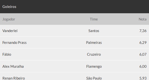 O goleiro santista tirou 8,5 após suas defesas difíceis e o pênalti defendido de Alecsandro já no final da partida na Vila Belmiro. Com isso, Vanderlei aparece com média de 7,36 na corrida pela Bola de Ouro.