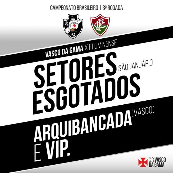 Os ingressos para o Setor VIP e Arquibancada (Vasco) estão esgotados para o clássico entre Vasco e Fluminense, neste sábado (27/05), em São Januário, pela terceira rodada do Campeonato Brasileiro. Ainda estão à venda os bilhetes para o Setor Social, que podem ser adquiridos pelos sócios vascaínos. A torcida tricolor somente pode comprar os ingressos para o Setor Visitante na Sede das Laranjeiras.