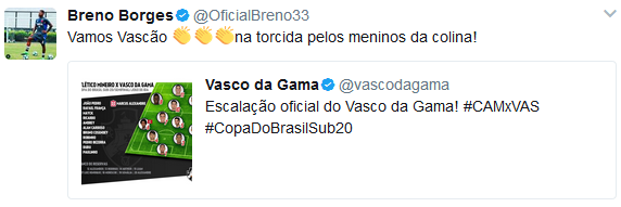 Em rede social, Breno torce pelos Juniores do Vasco nesta 3ª-feira; confira