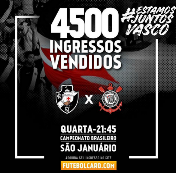 Já foram vendidos 4500 ingressos para Vasco x Corinthians em São Januário. Garanta o seu: futebolcard.com #EstamosJuntosVasco